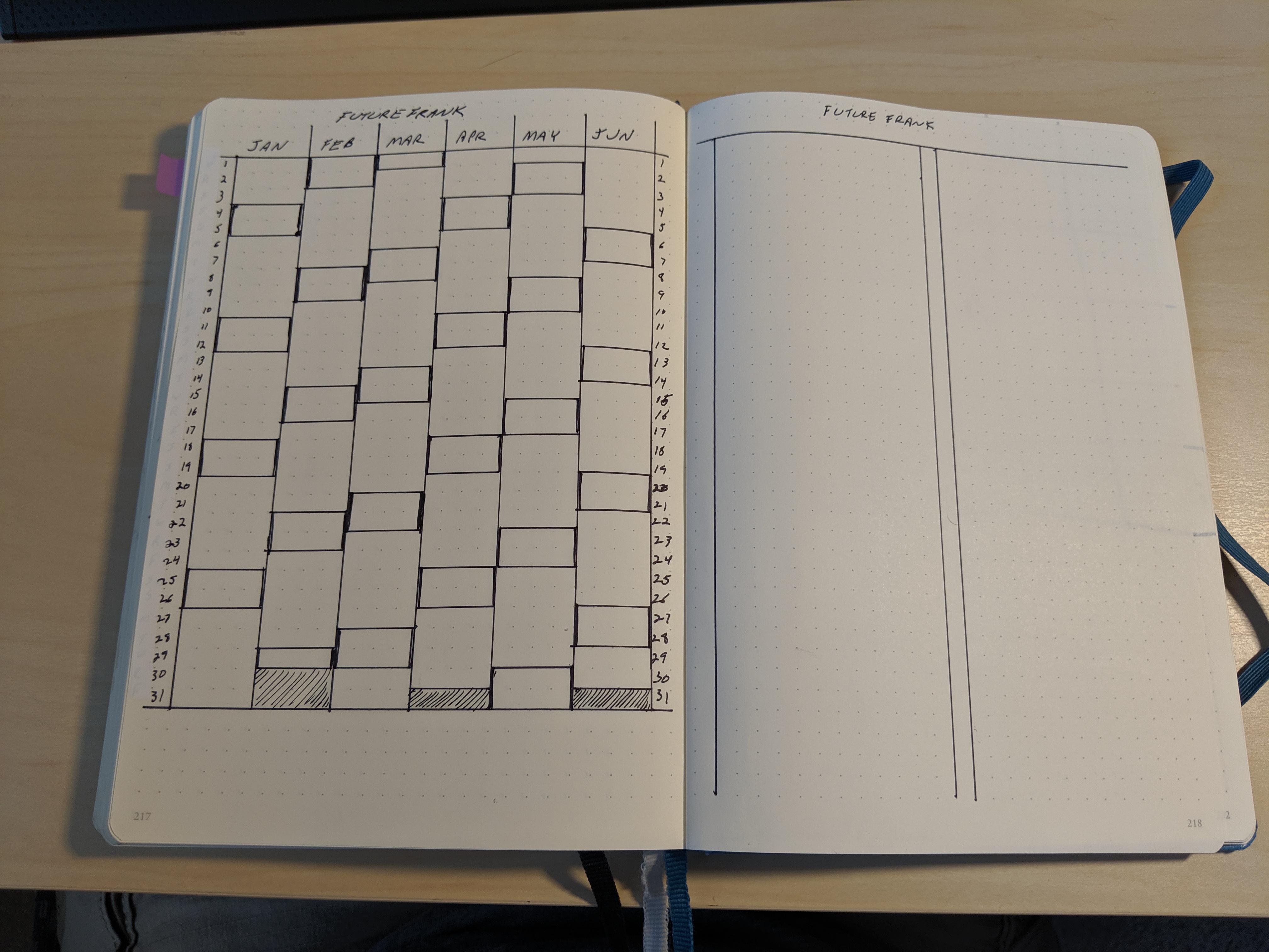 I’ve mocked up a FutureFrank in my own journal and think it works really well. As you did, I used 6 month in columns on one side and an index in the other.