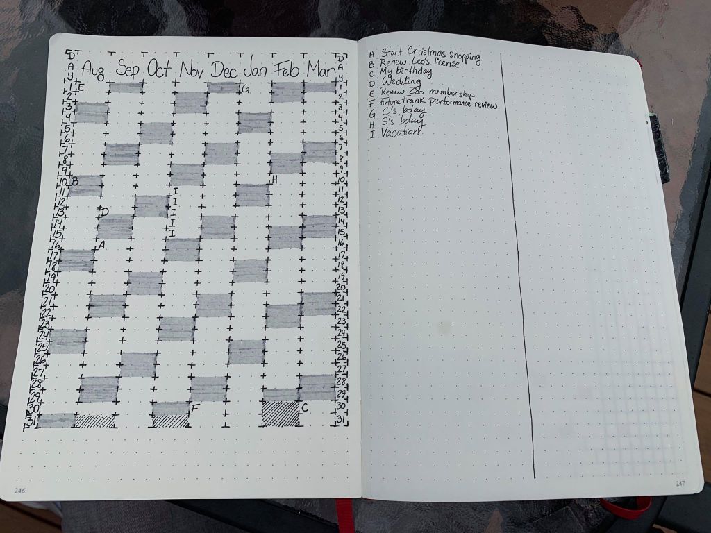 First spot on this list goes to our lovely BuJo Pirate Queen of the best Group on Facebook! Clean, concise, to-the-point. I’d expect no less from our fearless minimalist leader. (Noukka Signe)Another lovely minimalist spread, but don’t get comfy… It’s gonna get colorful up in here. (Valela VasatiLela)Mmmm….. Donuts…… A year-at-a-glance to let you know when you’re busy. (Bekah Metz @bekahbujos) Bekah gave me two. The first one was for glancing, but this one is for the nitty-gritty. (Bekah Metz @bekahbujos)Hell if I know, Bri! But I’m sure we can find out with your lovely, vulgar, color-coded gem of a Future Log! (Bri Kearney)Some folks don’t mess around with a basic Future Log. They just make a spread for every month of the year right away. (Carrie Sasville)Ooooo… Noir! If Bogart had a BuJo, this would be his Future Log. (Clairey Fairey)Stink at tiny writing? Don’t bother! All the benefits, half the work! (Danielle Bencina)A full year on a single spread, with room to write. (Elisa Bisignano)Smaller… SMALLER I SAY!!! (Ella Ma)I’m a “one book, one pen” kind of guy, but I’ll admit that this Future Log is pretty slick. (Emily Twedt Albrecht)Worst spelling ever! Unless of course you’re Estonian – then it’s fine. This reminds me of a comic book. (Ene McLaughlin)Another from Ene. Still kind of comic-booky, but a bit more minimal. (Ene McLaughlin) SERIOUSLY cool. It’s like a psychic illuminati Advent calendar! I’m sure that’s what she was going for. (Jessica Roberts)Not artistic? A little washi tape can go a long way. (Josefine Svelle)Bold and iconic. (Kari Lutters @kari.plans.stuff)Another full year fit onto a single page, with a little color to boot. (Katie Hutton)Artsy but spacious. (Kira Rasberry)Ah yes, the ProLog. This came into being as a result of my failed experiment with ditching Google Calendar. There’s a whole entry about it over here. (Me)Good ol’ FutureFrank! More about this here. (Thalia Sawatzky)Here’s an older one from Thalia. Basic, but with flair. (Thalia Sawatzky)Themed but clean. (Mande Ballew)I don’t know what you call this color theme but I’m digging it. (Melinda Whiteman)Really well done here. Great drawing at the top with juuust a splash of color. (Nakita Cunningham @kitasbujo)Loving the details on the flowers. Quite nice. (Rebecca Derichsweiler Carrillo)A playful and artsy spread. (Rébecca Lesage)Sweet font and a sweet pen. Each month with a little spot especially for birthdays. (Susan Gately @bujo_suzie)Is it just me, or do those calendars at the top remind you of those sliding number puzzles? I dig it. (Ta’Shandra Bradley @thekocholatejournalist)And last but certainly not least… I just realized that the ol’ Alastair Method was not properly represented here. Had to get it in. (Me again)