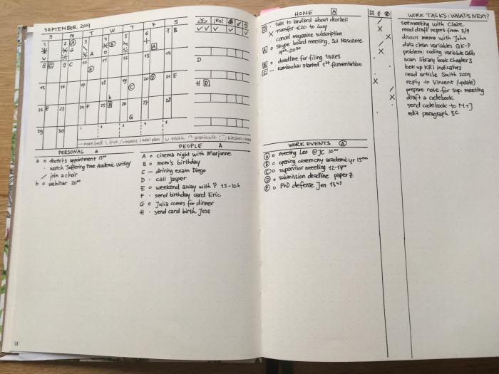 As a PhD researcher, the majority of my work consists of tasks within research projects that don’t have a specific due date. I have used the Frankenlog monthlies for a little under a year now and I love the overview it gives me. It’s simple and easy to use, especially when I started to group my tasks and events into different categories or ‘contexts’ (more about that and ‘Getting Things Done’ here). In practice, though, I found my “Work” column kept getting crowded with work events (date-specific) and tasks without due dates. They were mixed together and hard to reference. I needed to find a way to manage them.
