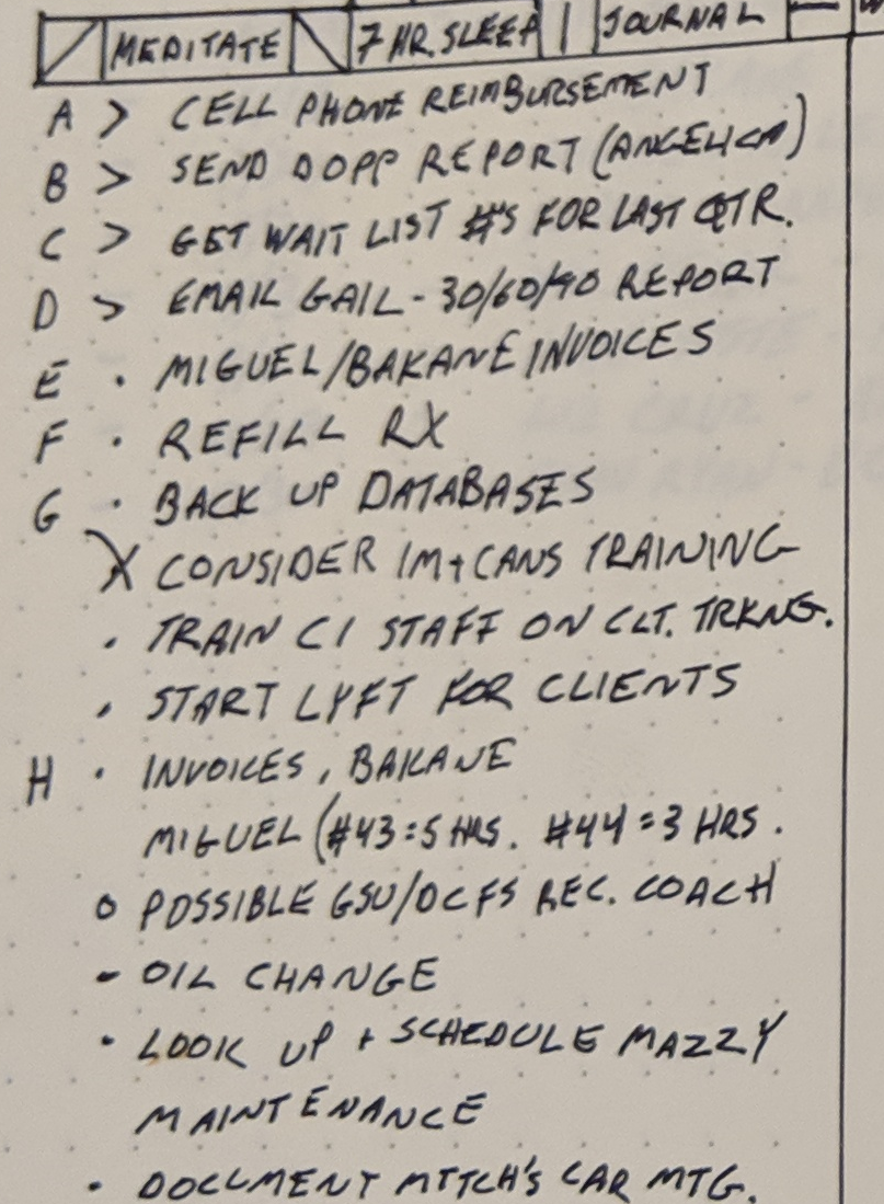 “But what if I run out of letters in the alphabet?” I hear you say! If you have more than 26 dated tasks, start the alphabet over at “A” but circle the letters. Or put a box around them. Or use different colors (if you’re one of those crazy hippies that use something other than a black pen).