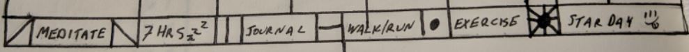 The top of the left page of the spread holds the monthly calendar. Each day is a 3×3 area with its date and a box (gray in the pic above) to be used for tracking habits. Using the key at the bottom of the calendar, you can track up to five different habits each day by marking the small box to indicate which habits have been completed (I usually just track four, but you do you). Entering all the marks creates a starburst symbol. Congrats! You’ve achieved a “Star Day!” I know, it’s cheesy, but I find it strangely motivating. Feel free to write “Nailed It,” or “Boo-Yah!” instead.