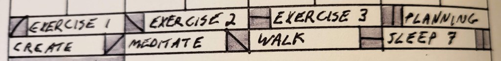 It’s all about efficiency! I was inspired by Michael P. Fox’s “Hydration (quadrant counter)* when I realized that I could use a single box to track several habits! I needed to be able to really maximize available space, and the system of assigning letters to tasks was a huge breakthrough that meant I could use every single line of the task list and never have to worry about wasting space.
